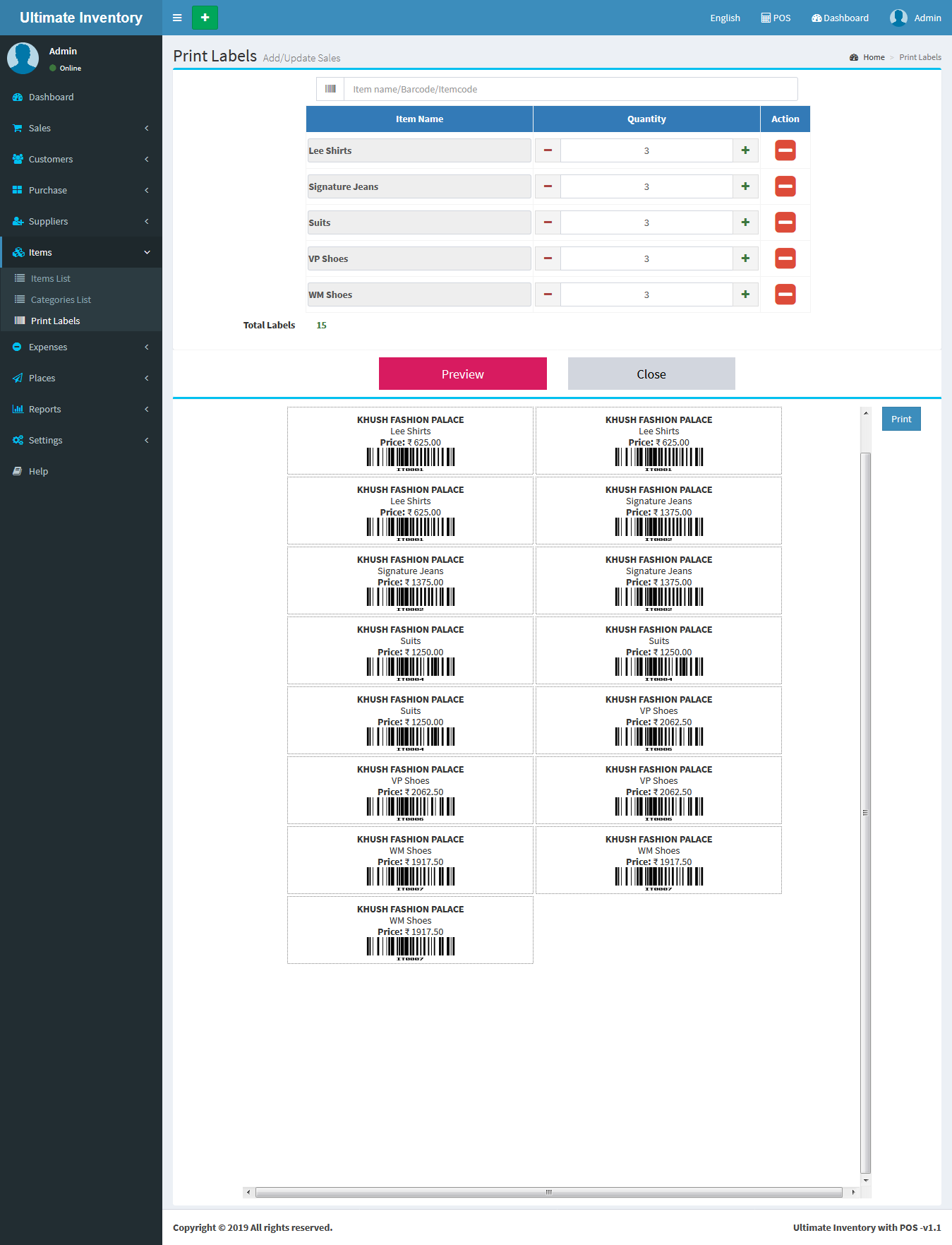 Select Items From Search Box and Select Number of quantities of Labels and Click on Preview Button and take prints.
